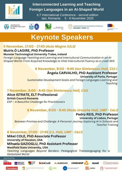 În perioada 5–9 noiembrie 2025, Iașul va găzdui conferința internațională Interconnected Learning and Teaching. Foreign Languages in an AI-Shaped World (ILT 2025), un proiect comun al celor cinci universități de stat din Iași. Evenimentul este organizat de Asociația ILT de Limbi Străine, în parteneriat cu Universitatea „Alexandru Ioan Cuza” din Iași, Universitatea de Medicină și Farmacie „Grigore T. Popa” Iaşi, Universitatea de Științele Vieții „Ion Ionescu de la Brad” Iaşi, Universitatea Tehnică „Gheorghe Asachi” Iaşi și Universitatea Națională de Arte „George Enescu” Iaşi.